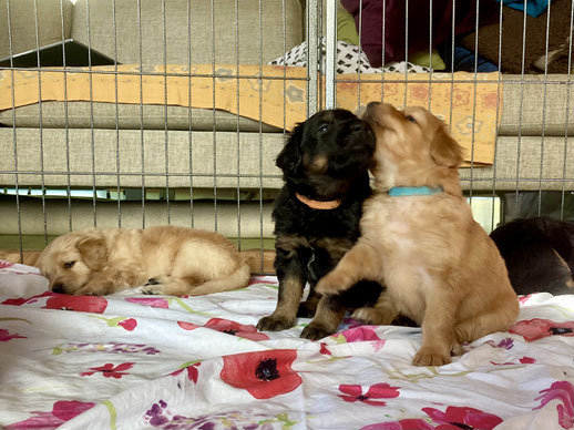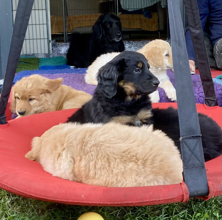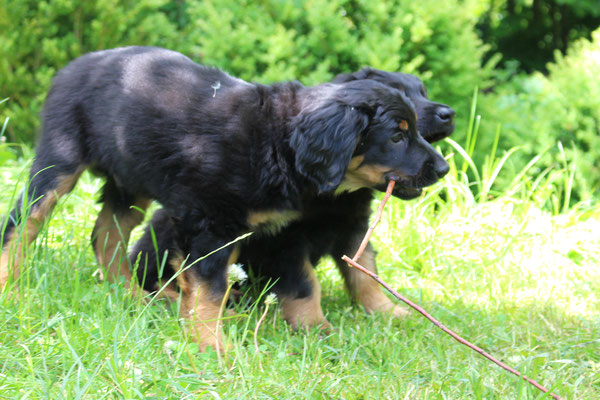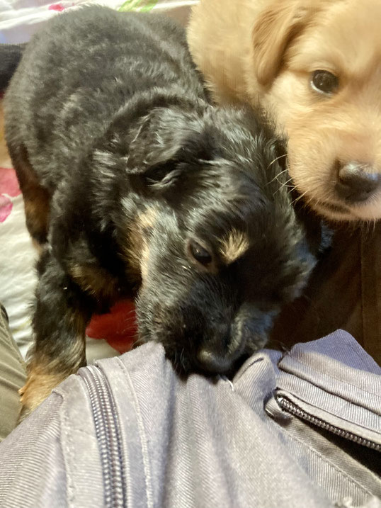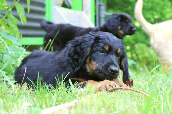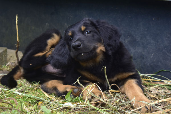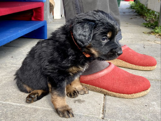 freundlicher und zugewandter Welpe, der gerne mit uns kuschelt. Er spielt ausdauernd mit uns und seinen Geschwistern in unserem großen Garten. Autofahrten kennt er von unseren Ausflügen zum